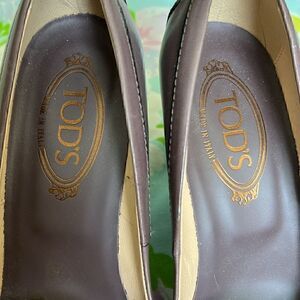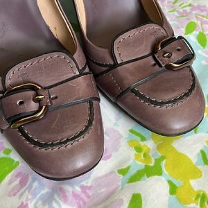 Gorgeous purple, gray leather heels from Tod’s. Some peeling on the insole of the top layer, no color is coming up. 3” block heels and rubber soles resist skids. The color is pretty true in the pictures. Flaws are pictured. Silver pen marks on outer soles no affect to shoes.