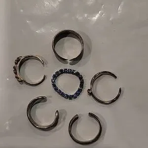 Just in time for summer! Set of six, adjustable toe rings. The blue crystals one stretches. They are sterling silver, a bit tarnished so just need a little buffing to shine!
