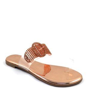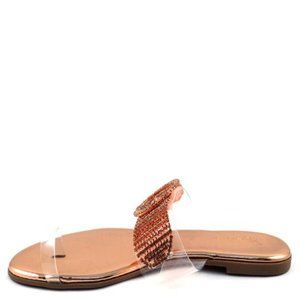 Keeping it sassy in these slide in sandals. Featuring an opening clear toe ring, upper rhinestone band detail with a sharp metallic look and soft foot bed.