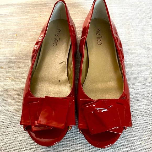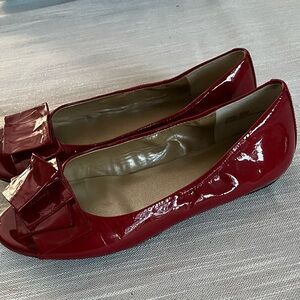 Red toeless flats with a bow.