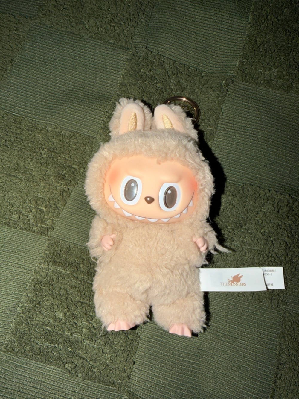 Cute Labubu “Toffee” beige plush keychain from POPMart. Soft, fluffy exterior with an expressive face for charm. Convenient keyring attachment for backpacks or bags. Beige color adds a neutral, cozy look.