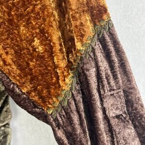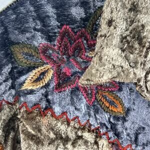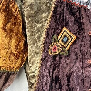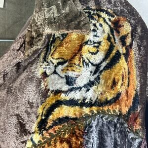 Unique patchwork design. Features tiger embroidery. Soft velvet texture. Button-up style.