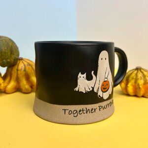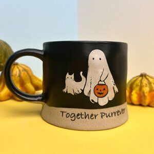 Celebrate spooky season with this adorable “Together Purrrever” Halloween mug! Featuring a ghost dog and cat duo holding a pumpkin bucket, it’s the perfect cozy cup for coffee, tea, or cocoa.