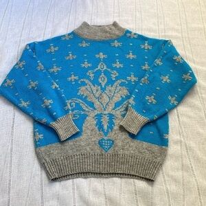 Loving the retro vibes of this 80s sweater! Brand is Together and size is small 4-6. Please see photos for measurements. Fabulous turquoise blue and gray. Mock turtleneck. Wool blend. Lightly preloved, with so much life left! Fun sweater to add color and vintage to your life during the colder months.