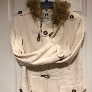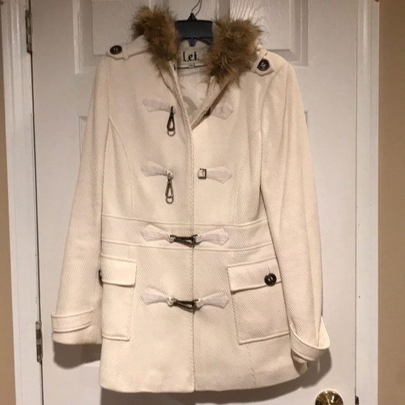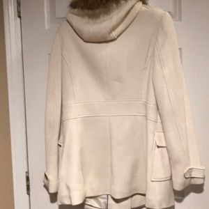 Winter white with fur trim around hood. Button missing on tab on right sleeve