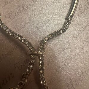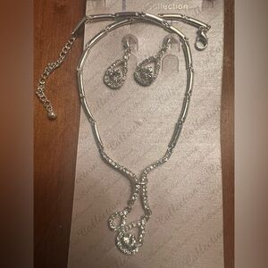 Stunning silver toned, rhinestone necklace and earring set with intricate design. Ideal for elegant occasions. It is new and never been used. I took it out of the packaging because the center piece on the pendant had snapped. I glued it back together with heavy duty glue. It’s only noticeable if you really look closely (see pictures). It is a close fit although there is an extension of 3 inches on the chain to adjust how far it hangs.
