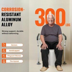 Robust and Durable: The handicap toilet seat frame is constructed from high-strength, non-corrosive aluminum alloy, which is ideal for wet bathroom environments. The toilet grab bars' precise machining and welding support up to 300 pounds, providing users reliability and peace of mind.