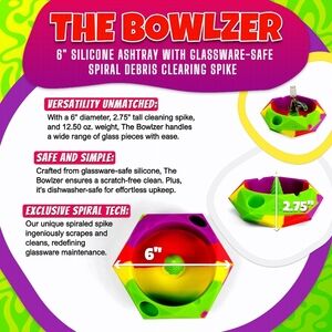 Meet The Bowlzer! Born in a land where ashtrays were dull and cleaning glass bowls was chore. This clever little fellow sprouted a spiral, not to be the life of the party, but to be the hero of the after-party. Born with a twist, The Bowlzer decided, why just be an ordinary ashtray when you can be so much more? So, it evolved, growing a soft silicone spiraled cleaning spike to help your spent glass bowls start fresh.