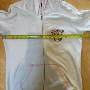 Adorable kawaii tokidoki hoodie with playful Donutella feeding donuts to a unicorn. Features white base and pink accents. Perfect for casual wear. Size is XL but fits more like an L. Put to pit is about 20". Cute Tokidoki logo on the zipper pull too.