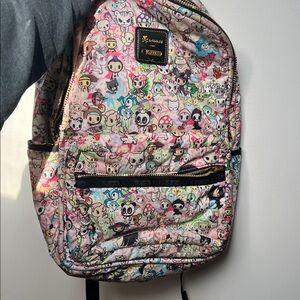 Charming backpack with diverse character designs. Features a lively mix of colors.