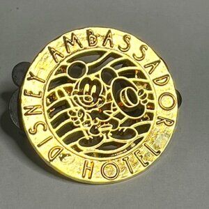 Mickey Mouse is shown with cane and hat inside the circle; on the outer portion of this round pin, it reads "DISNEY AMBASSADOR HOTEL."