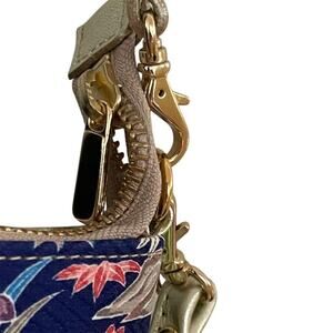 Japanese Tokyo Kimono shoulder bag features a multicolored silk floral kimono fabric on navy fabric, complemented by gold-tone metallic leather accents. The dimensions of 10 inches in width, 6 inches in height, and 3 inches in depth. The bag includes a metallic leather shoulder strap made from gold-tone leather, which is adjustable and detachable. The interior is lined with multicolored fabric and includes an inner pocket. The bag secures with a zipper closure and is crafted in Japan, . The hardware is gold-toned.This doesn't appear to have been used. Gorgeous. This item is pre-owned. A259B