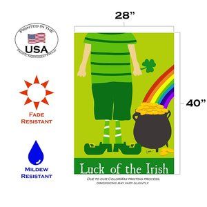 Celebrate St. Patrick's Day with the Toland Home Garden Luck O the Irish Flag. This flag features a leprechaun next to a pot of gold.