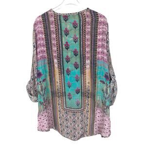 Tolani 100% Silk Printed Tunic Top Roll Tab Sleeves Beach Resort Vacation Large