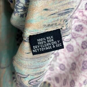 100% silk floral bandana print tunic top. 3/4 roll tab sleeves. V-neck. Pulling of fabric under one armpit. Size large. Please see photos for measurements.