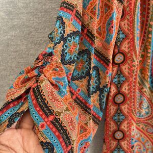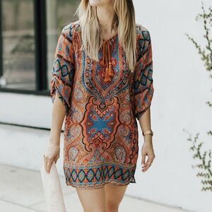 Tolani Boho Silk Tunic Dress Size Medium Vibrant Festival Hippie Tassels Cover Up