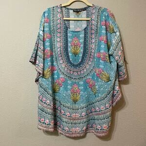 Tolani Collection Womens Blue Floral Kimono Sleeve Scoop Neck Poncho Top Size MP