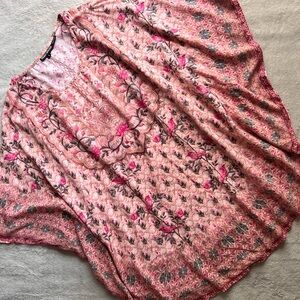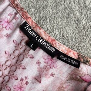Excellent used condition. Floral Printed Caftan by Tolani Collection in cream with pink and green detailing. Bohemian-meets-Victorian aesthetic, perfect to pair with jeans or dress up with pants. Lightweight pullover tunic top blouse with round neckline and relaxed, oversized silhouette. Short kimono sleeves with sewn, draped sides. Allover brocade print with floral roses, birds and paisley design, see video. 100% modal. Made in India. Size large, see photos for measurements.