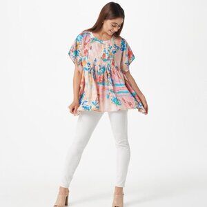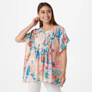 No longer available on QVC website. Actual top is more colorful and vivid than the one in the stock photos.
