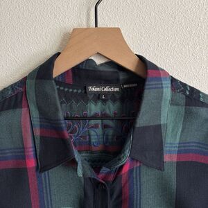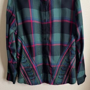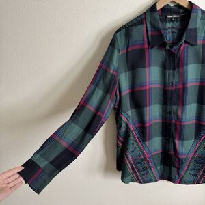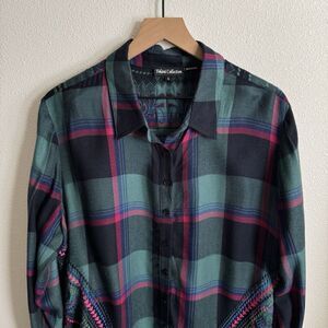 Tolani Collection Top Womens Large Green Button Up Flannel Embroidered Boho