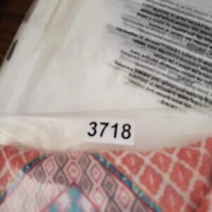 Color/Pattern: Orange/coral diamond print with multicolor blue/teal/pink ikat-inspired printed bib and border hem