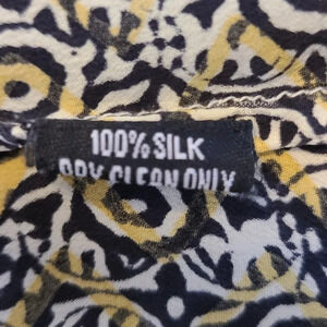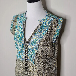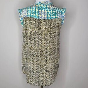 Tolani 100% Silk sleeveless button down blouse in beautiful yellow, blue, black & white boho print. Sleeves and neckline feature raw frayed hem design. Excellent preowned condition.