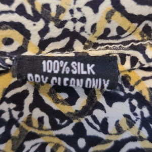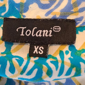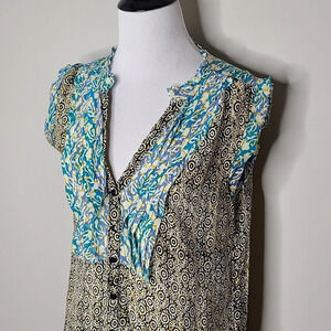 Tolani 100% Silk sleeveless button down blouse in beautiful yellow, blue, black & white boho print. Sleeves and neckline feature raw frayed hem design. Excellent preowned condition.