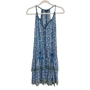 Tolani Tully Blue Print Smocked Tiered Sleeveless Mini Dress Boho Tassel