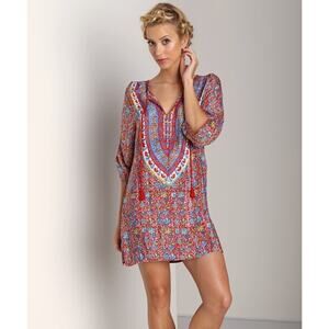 Tolani Tunic Dress 100% Silk Floral Geometric Large Blue Red Luxury Boho Chic Peasant