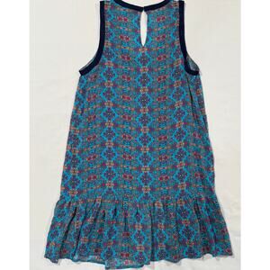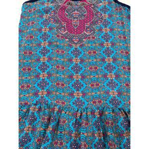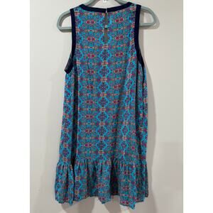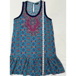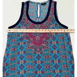 Vibrant sleeveless dress by Tolani. Features intricate patterns. Perfect for casual outings. Front to back asymmetrical hem.