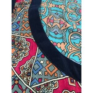 Soft and breathable fabric in turquoise, fuchsia, and gray are primary colors with navy blue trim around neck and arms.