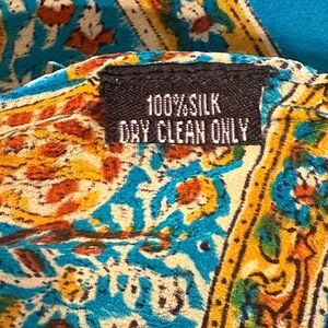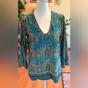 Tolani Women’s Silk Beaded Bohemian Printed Size Small Blouse Teal & Mustard