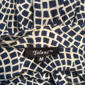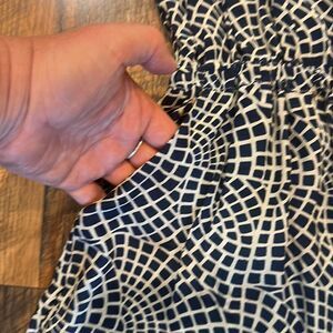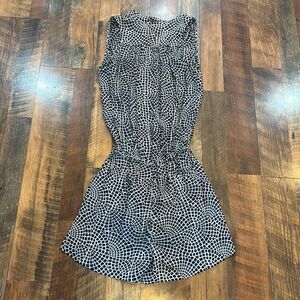 Great condition romper with two side pockets & one back pocket. The waist is elastic and measures 11 inches across unstretched, but can stretch up to 19 inches across. The color combination is navy and white. There is no material tag but this has a lightweight feel like rayon. The pit to pit measurement is 18 inches across and the total length is approximately 35 inches with the inseam measuring 3 inches.