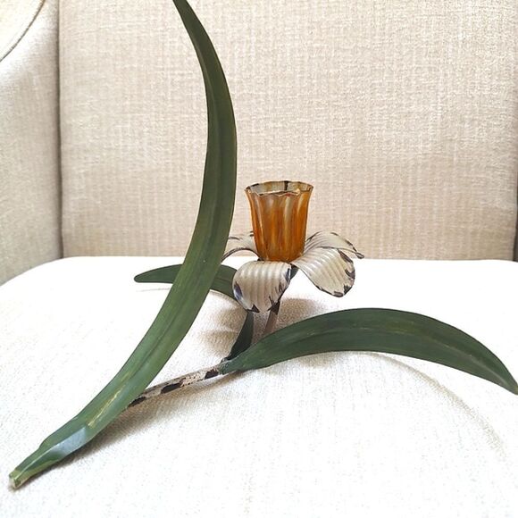 Vintage Tole Metal Daffodil Candleholder. Sculptural Italian style rustic painted daffodil with ribbed petals and 3 long slender leaves that will add interest to most decor styles.