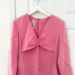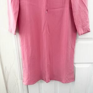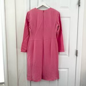 Size 10 from Tom and Linda Platt. Content tag removed but has a lightweight crepe material feel. Back zip closure. V neck with tie cinched neckline creating the bust silhouette. Long sleeves. Sheath silhouette. Perfect barbie pink day dress for brunch or any day event. Vintage. Preowned in good condition with no stains or tears.