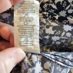 the main background color is a dark blue then you see a white floral pattern all over. collared neckline. the inside of the collar is a square design that is different from the main pattern. then you see a lime green detail around the inside collar. long sleeves approximately to the wrist. the wrist has 2 buttons that makes it slightly adjustable. then slightly up from the wrist there is another button closure. tag inside says slim for, wrinkle free and comfort 4 way stretch. rounded hemline in the front and the back. buttons start at the neckline and go almost the hemline. found no issues or flaws. smoke-free home and pet friendly home.
