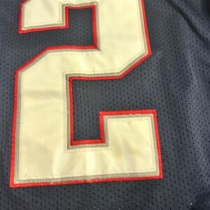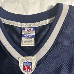 Flaw Stain on Jersey Authentic Tom Brady #12 New England Patriots jersey, a must-have for any football fan or collector. This Reebok-manufactured jersey features the Patriots' iconic navy blue color scheme, complemented by the team's logo on the sleeves and the NFL Equipment patch on the chest. The jersey proudly displays Brady's name and number, making it a perfect way to show support for the legendary quarterback. Note that there are some stains on the numbers and a small mark on the front of the jersey.