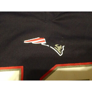 Pre-owned, half of the Patriots logo on the front is missing. Brady has a little bit of wear, and has a little spot on the back "2". (See Photos.).