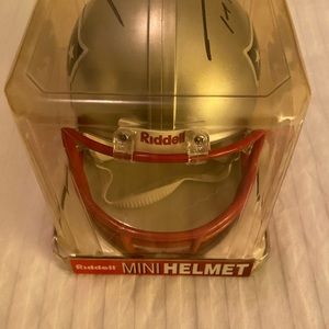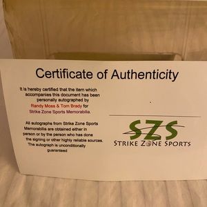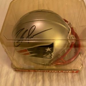 Riddell Autograph Mini Helmet Signed by Tom Brandy and Randy Moss. With Certificate of Authenticity. Never taken out of box only to take theses photos. Condition is in good.
