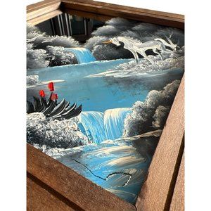 Frame has some scratches as shown. Bottom of artwork has a scratch shown in photo. Item is ready for hanging. All measurements are in photos. Please inspect all photos.