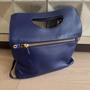 This Tom Ford Alix Fold Over Crossbody Bag Leather, crafted from cobalt blue leather, features a cutout top handle, exterior back zip pocket, vertical front zip, and gold-tone hardware. Its fold-over top opens to a dark brown microfiber interior with a side zip pocket.