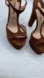 Gleaming logo hardware on the buckle strap subtly brands this goatskin-suede sandal in an elegant T-strap silhouette with a platform balancing the towering block heel. These heels are preowned. Slightly signs of wear. Review all photos and video.
