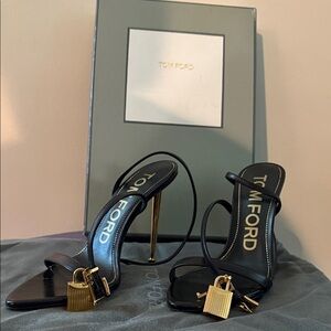 WORN ONCE LIGHTLY! Comes w/ box and shoe bags. 9.5/10 condition. Chic Tom Ford heels in sleek black. Features elegant gold details. Ideal for stylish events.
