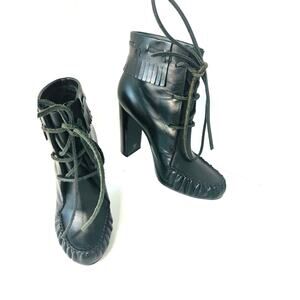 Tom Ford Black Leather Fringe Lace-Up Ankle Boots Size 35.5 Block Heel Designer Booties