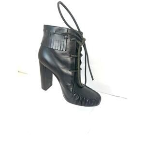 Tom Ford Black Leather Fringe Lace-Up Ankle Boots Size 35.5 Block Heel Booties