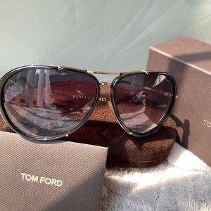 Elegant Tom Ford aviator sunglasses. Features black lenses with gold accents. Ideal for a chic look.