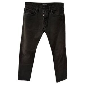 Delivery Duty Paid included – The Tom Ford Hidden-Buttoned Jeans in black cotton blend classic denim craftsmanship with a sleek, modern edge, featuring a clean front for a refined finish. Cut from premium cotton, they offer a structured yet comfortable fit that transitions effortlessly from day to night. **Style tip:** Pair them with a crisp button-down shirt and Chelsea boots for an elevated casual look, or add a leather jacket for a more rugged, sophisticated vibe.