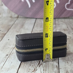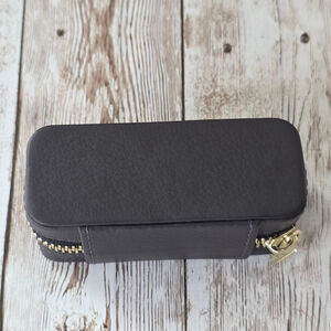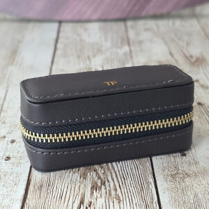 This is a Tom Ford case, new without tags or box. The exterior is a darkbrown, textured material, possibly leather or a synthetic alternative. It features a gold-toned zipper closure and the initials 'TF' in gold on the front. The interior is lined with a smooth, dark material. There are no visible imperfections.