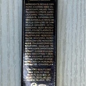 Luxurious Tom Ford lipstick. Bold red shade. Elegant gold packaging.