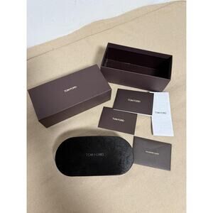 Color: Brown outer box with gold TOM FORD logo; black velvet hard shell case with TOM FORD logo; brown and white TOM FORD information cards; brown card marked POLISHING CLOTH.